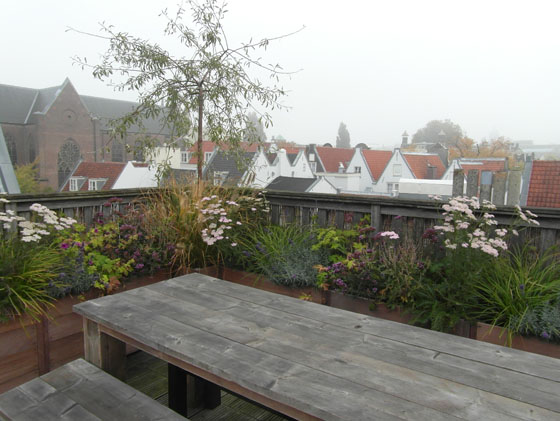 De Dakdokters bouwden de loungebank en de bakken en Bureau Groene Zaken vulde de beplanting in met heesters en vaste planten.